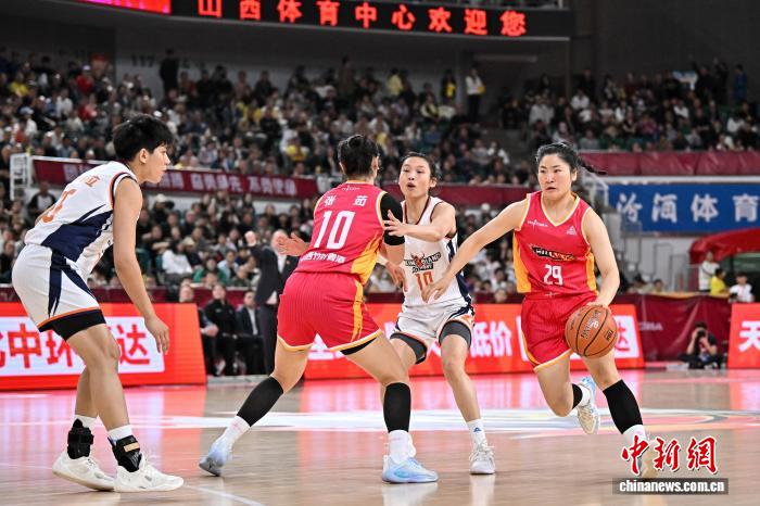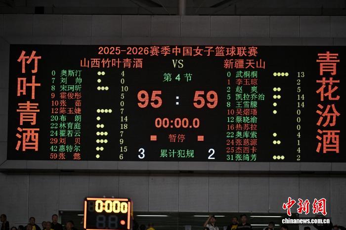 4月5日,正在太本举办的2025-2026赛季中原男子篮球联赛(WCBA)季后赛半绝赛第1轮角逐中,山西竹叶青酒队主场以95比59打败新疆天山队,总比分1:0抢先。中新社记者 韦明 摄