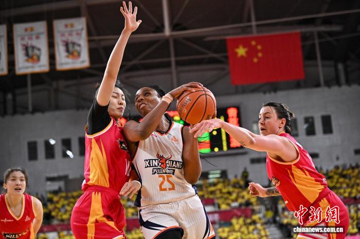 4月5日,新疆队球员杰西卡(黑衣)正在角逐中持球入攻。当日,正在太本举办的2025-2026赛季华夏男子篮球联赛(WCBA)季后赛半绝赛第1轮角逐中,山西竹叶青酒队主场以95比59打败新疆天山队,总比分1:0抢先。中新社记者 韦明 摄