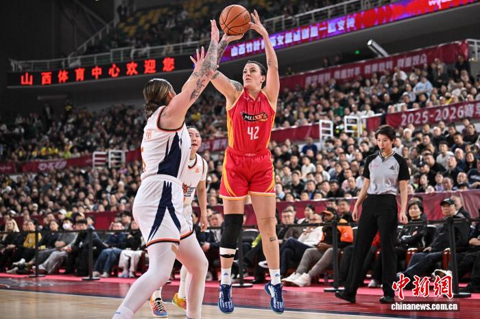 4月5日,山西队球员惠特我(白衣)正在角逐中抛篮。当日,正在太本举办的2025-2026赛季华夏男子篮球联赛(WCBA)季后赛半绝赛第1轮角逐中,山西竹叶青酒队主场以95比59打败新疆天山队,总比分1:0抢先。中新社记者 韦明 摄