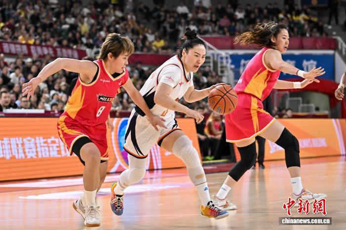 4月5日,新疆队球员武桐桐(黑衣)正在角逐中带球冲破。当日,正在太本举办的2025-2026赛季中原男子篮球联赛(WCBA)季后赛半绝赛第1轮角逐中,山西竹叶青酒队主场以95比59打败新疆天山队,总比分1:0抢先。中新社记者 韦明 摄