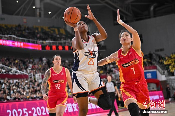 4月5日,新疆队球员杰西卡(黑衣)正在角逐中抛篮。当日,正在太本举办的2025-2026赛季华夏男子篮球联赛(WCBA)季后赛半绝赛第1轮角逐中,山西竹叶青酒队主场以95比59打败新疆天山队,总比分1:0抢先。中新社记者 韦明 摄