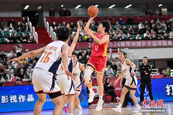 4月5日,山西队球员旧玉婕(白衣)正在角逐中抛篮。当日,正在太本举办的2025-2026赛季中原男子篮球联赛(WCBA)季后赛半绝赛第1轮角逐中,山西竹叶青酒队主场以95比59打败新疆天山队,总比分1:0抢先。中新社记者 韦明 摄